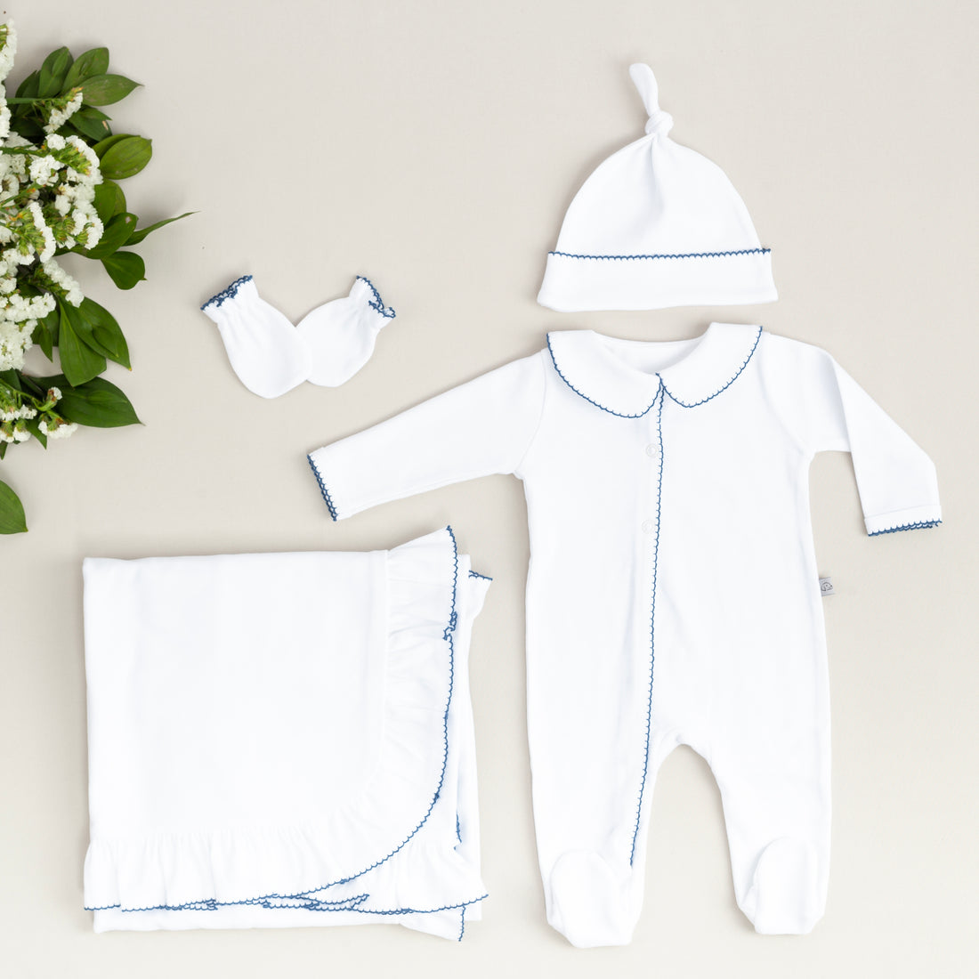 Asil İndigo Tığ İşi Süslemeli Çelenkli At Nakışlı Erkek Bebek 8'li Organik Hastane Çıkışı