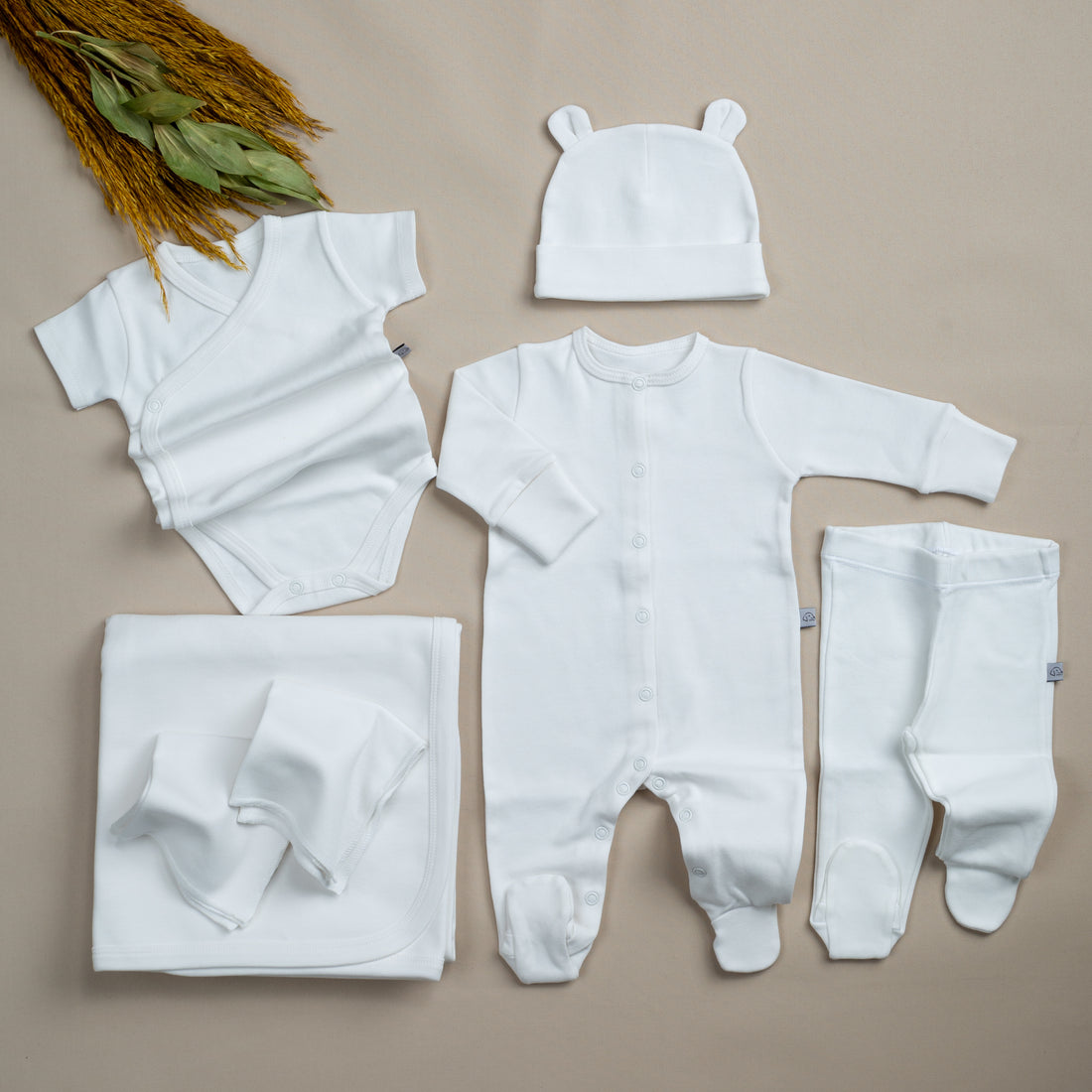 Basic 7'li Organik Hastane Çıkışı ŞAPKA- Kulaklı şapka TULUM- Önden çıtçıtlı kendinden eldivenli tulum- Hareket...
