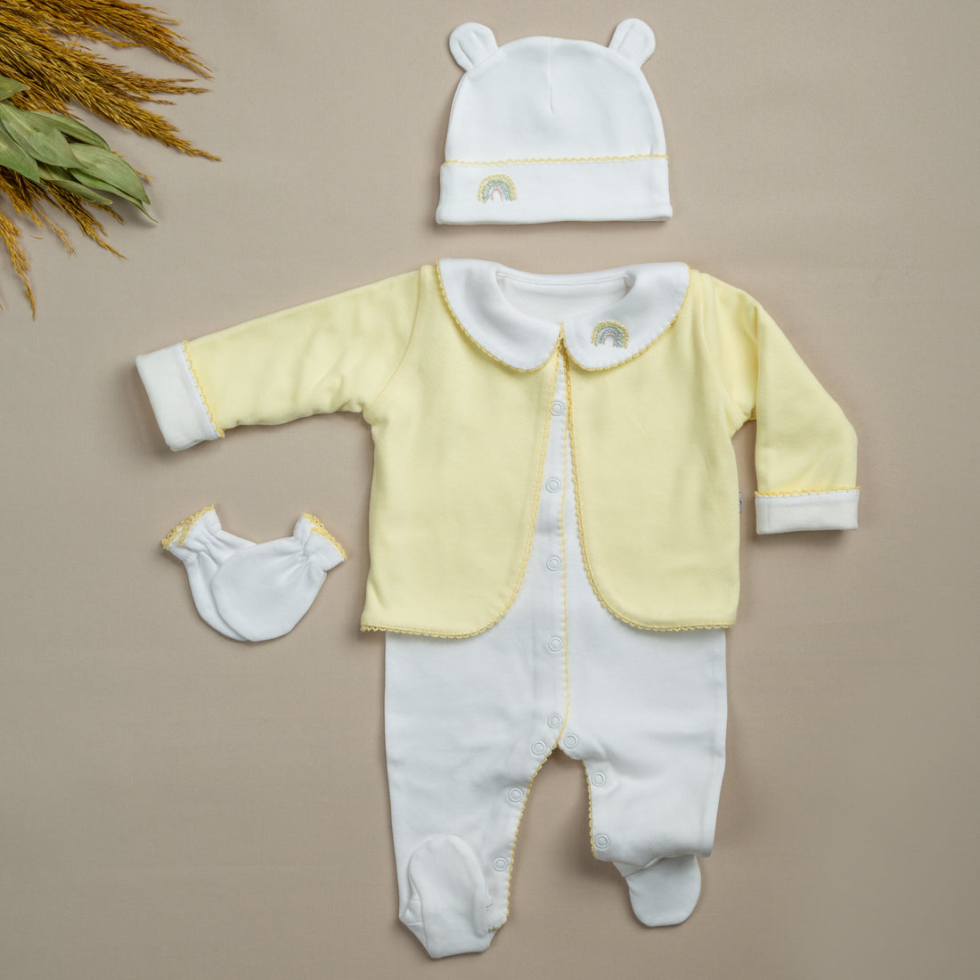 Elegant Sarı Tığ İşi Süslemeli Gökkuşağı El Nakışlı Hırkalı 5'li Organik Hastane Çıkışı