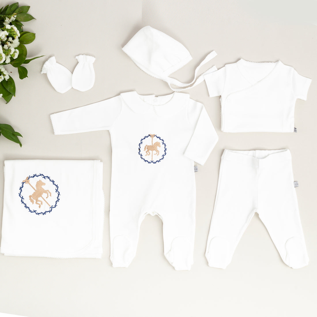 Royal Beyaz Tığ İşi Süslemeli Atlıkarınca Nakışlı (Laci-Bej) 7'li Organik Hastane Çıkışı