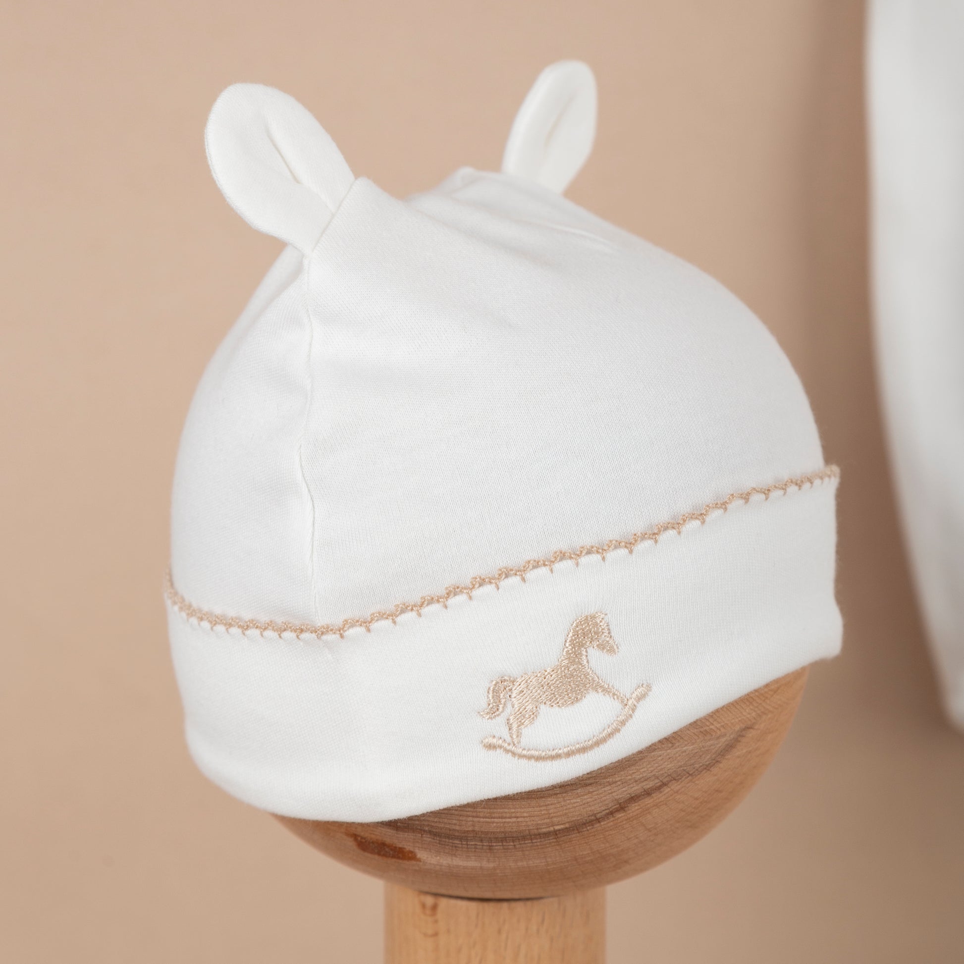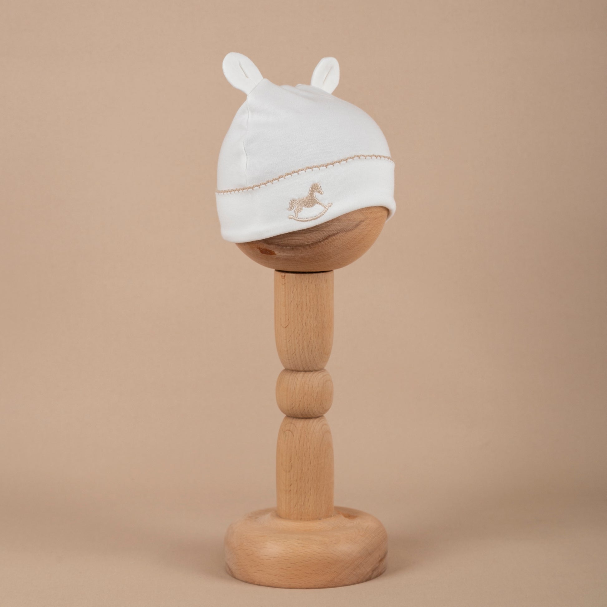 Asil Bej Tığ İşi Süslemeli Çelenkli At Nakışlı Bebek Şapkası