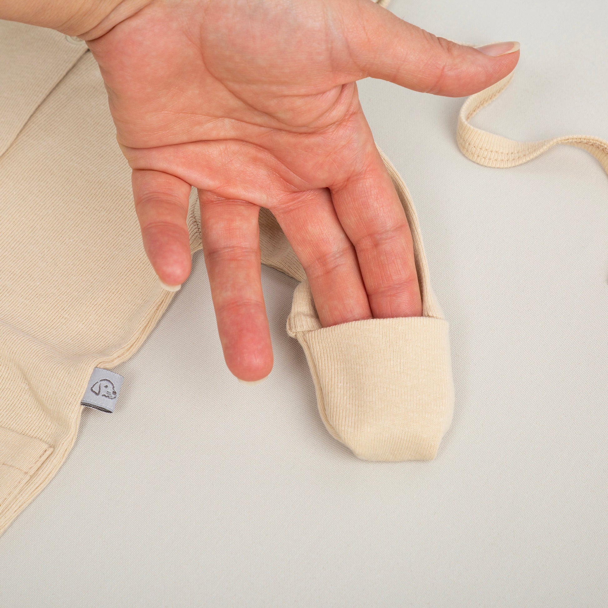 - Bej kendinden eldivenli bebe yaka önden çıtçıtlı tulum