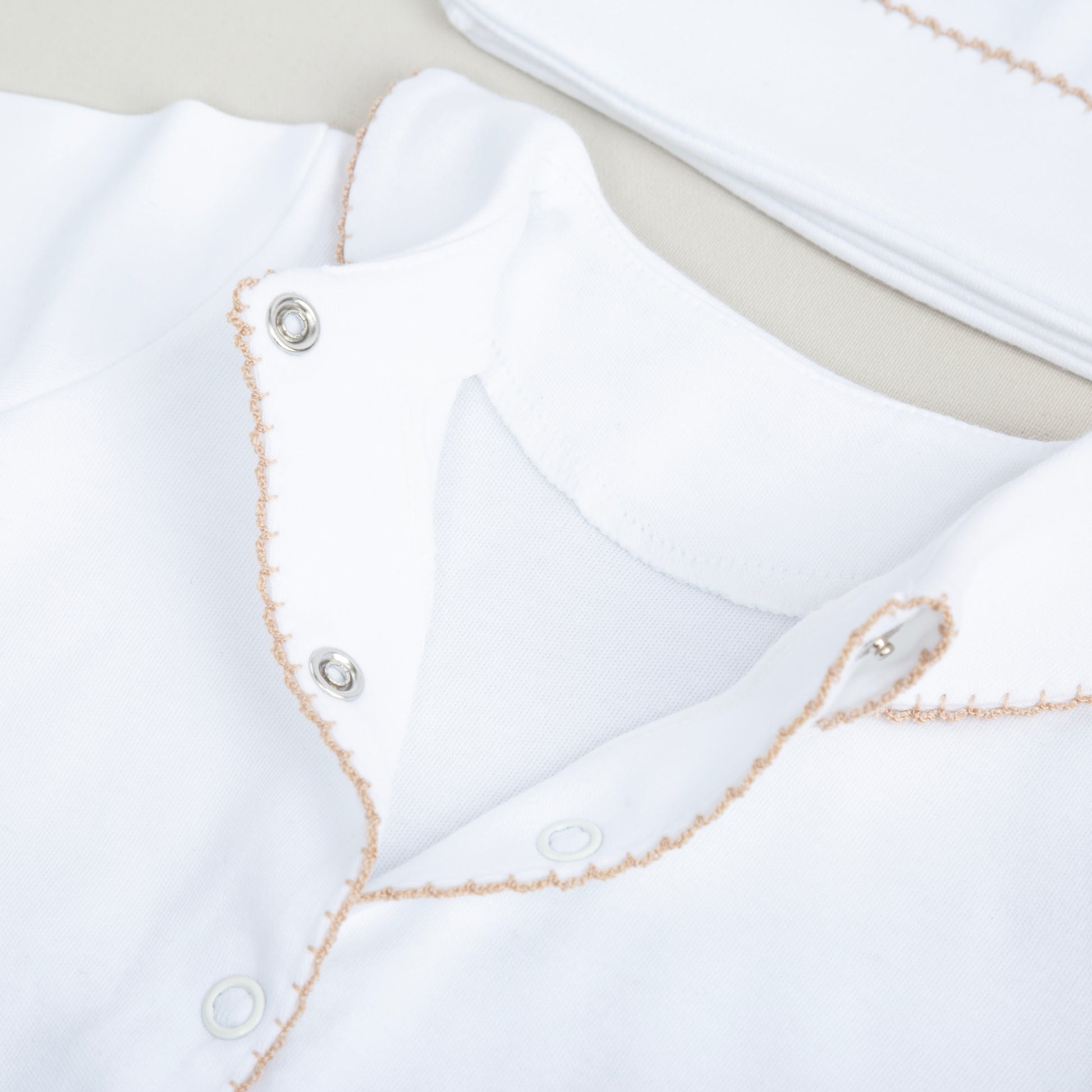 - Bej tığ işi süslemeli bebe yaka yandan çıtçıtlı tulum