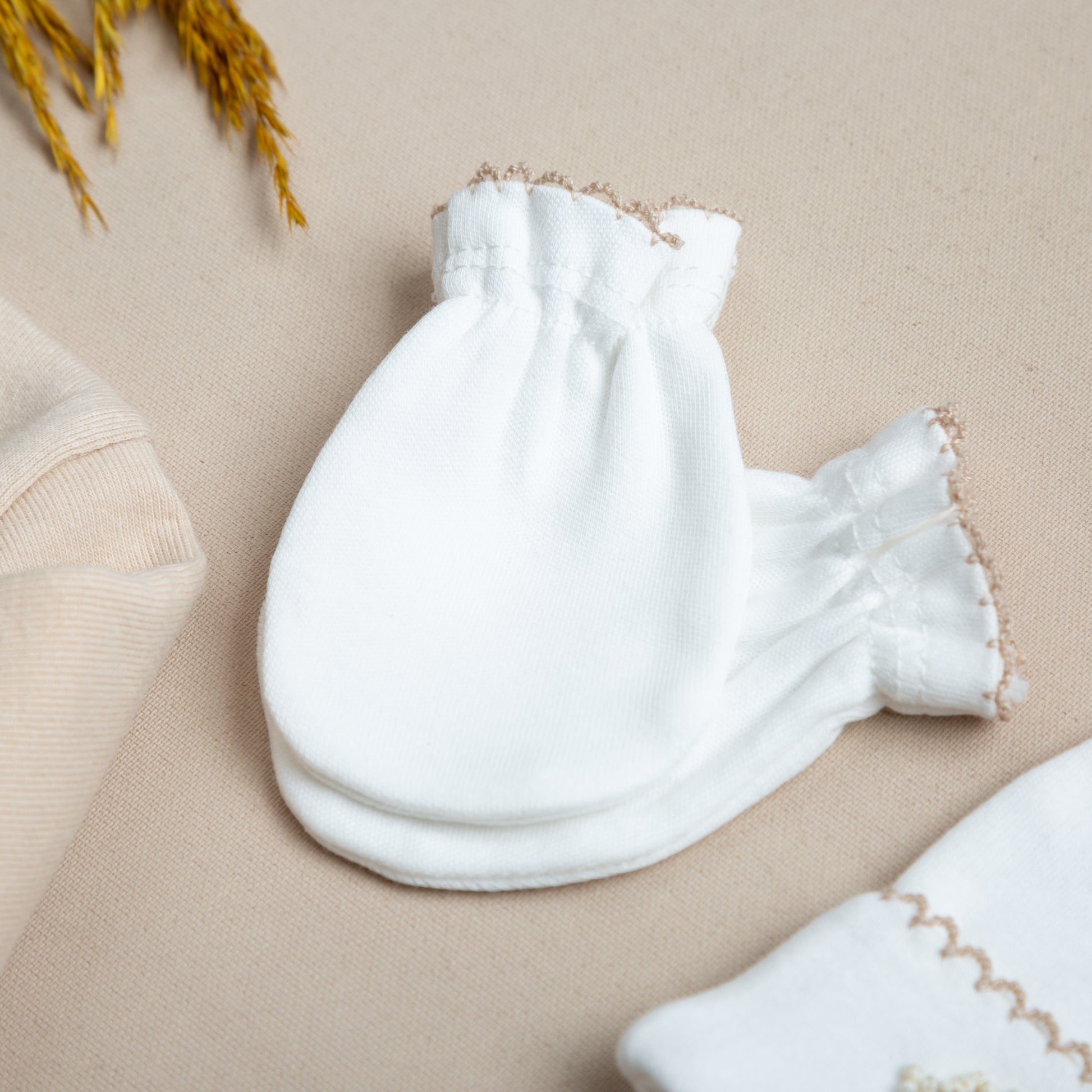 Elegant Bej Tığ İşi Süslemeli Hindiba El Nakışlı 5'li Organik Hastane Çıkışı