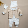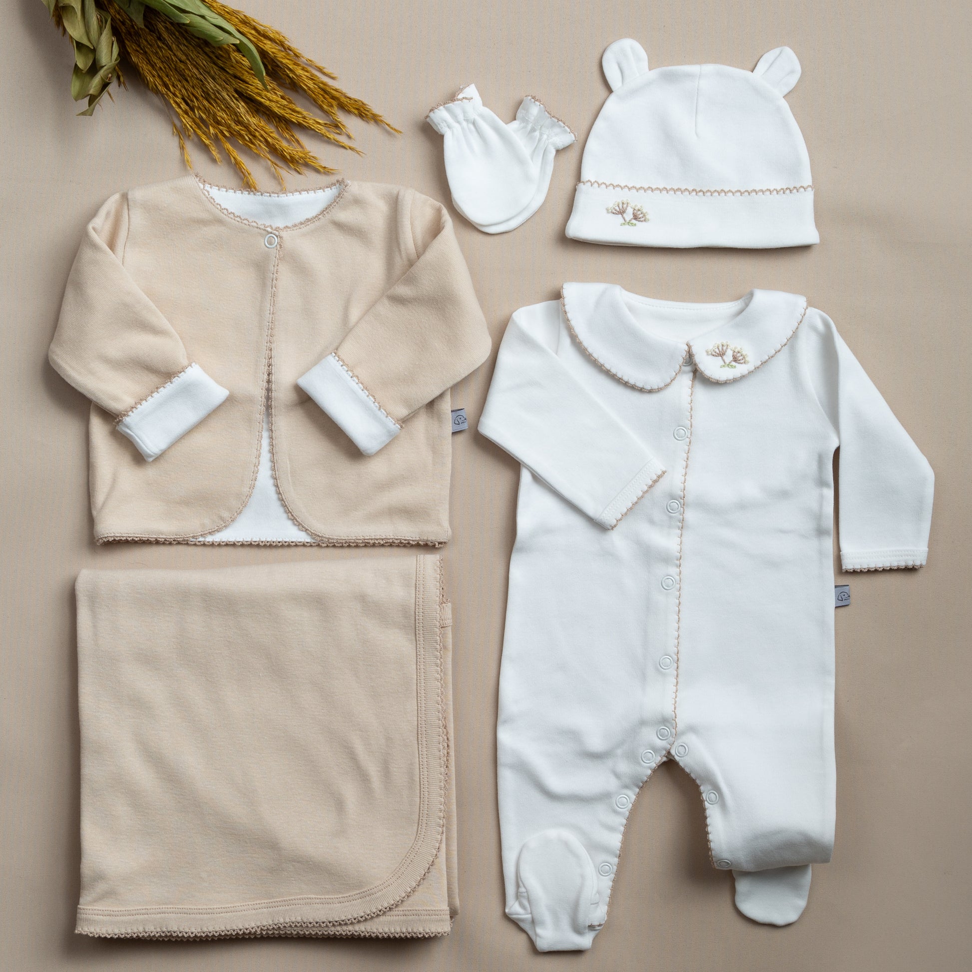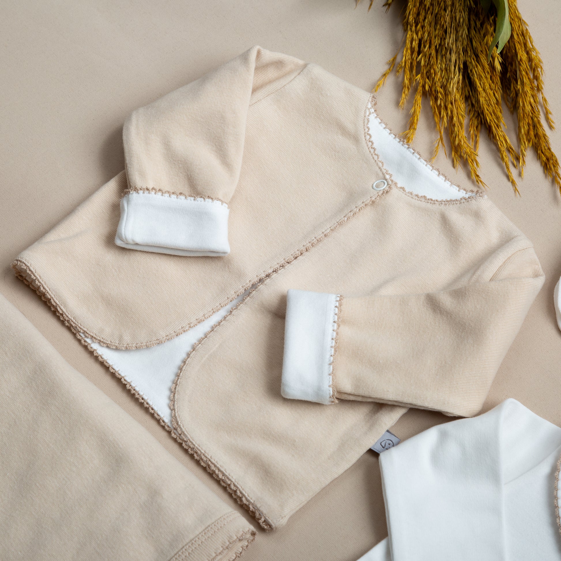 Elegant Bej Tığ İşi Süslemeli Hindiba El Nakışlı Hırkalı 6'lı Organik Hastane Çıkışı