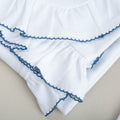- İndigo mavi tığ işi süslemeli fırfırlı battaniye.