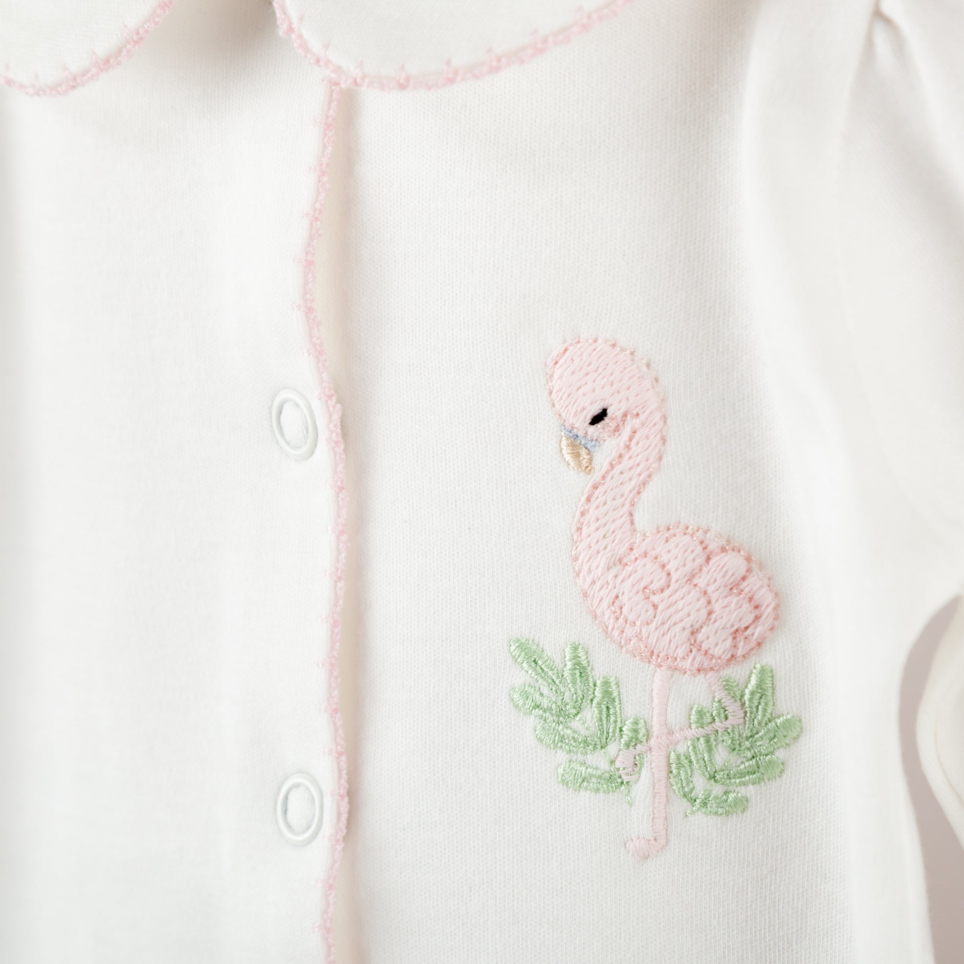 *Pembe tığ işi süslemeli flamingo nakışlı bebe yaka , kol ve bilek büzgülü, önden çıtçıtlı tulum