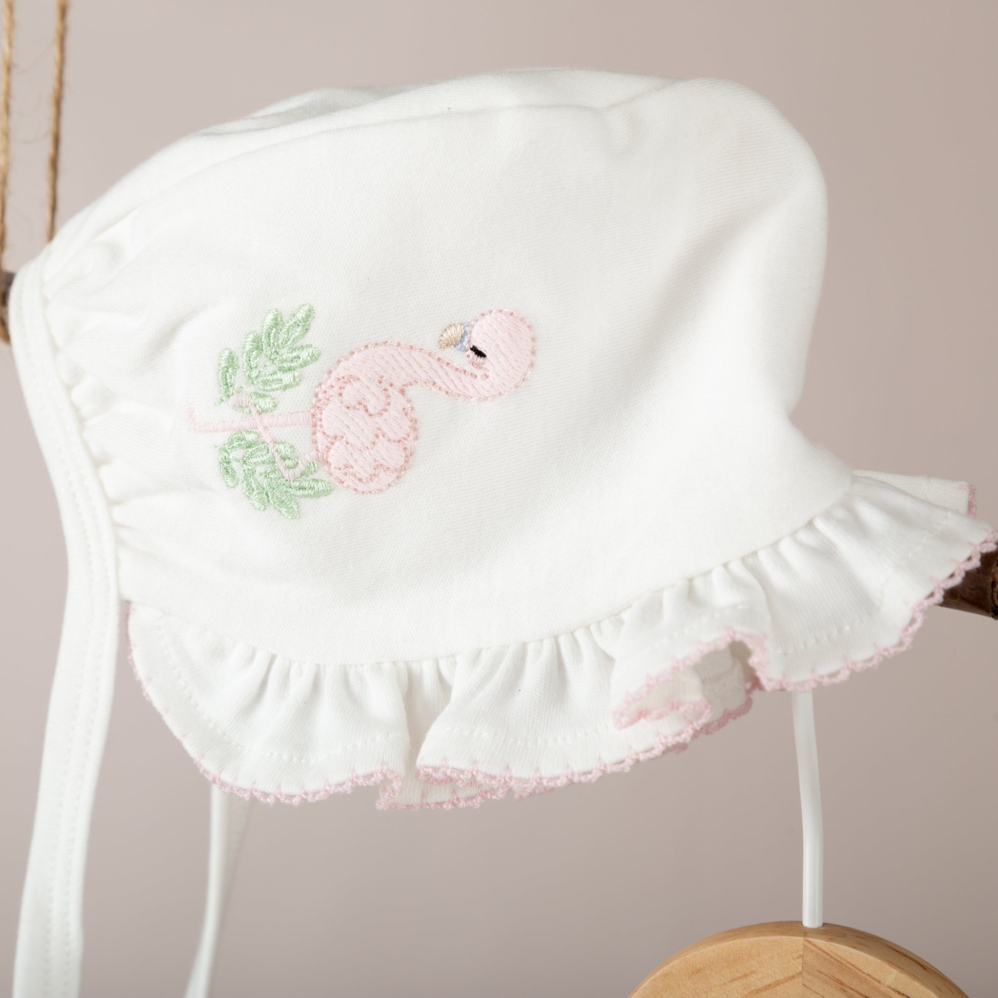 *Pembe tığ işi süslemeli flamingo nakışlı fırfırlı loura şapka