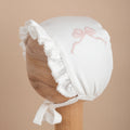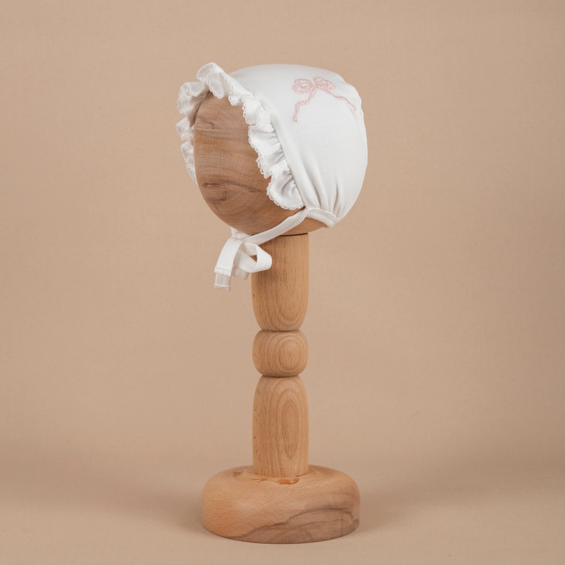 • Ekru tığ işi süslemeli, pembe fiyonk nakışlı, fırfırlı loura şapka.